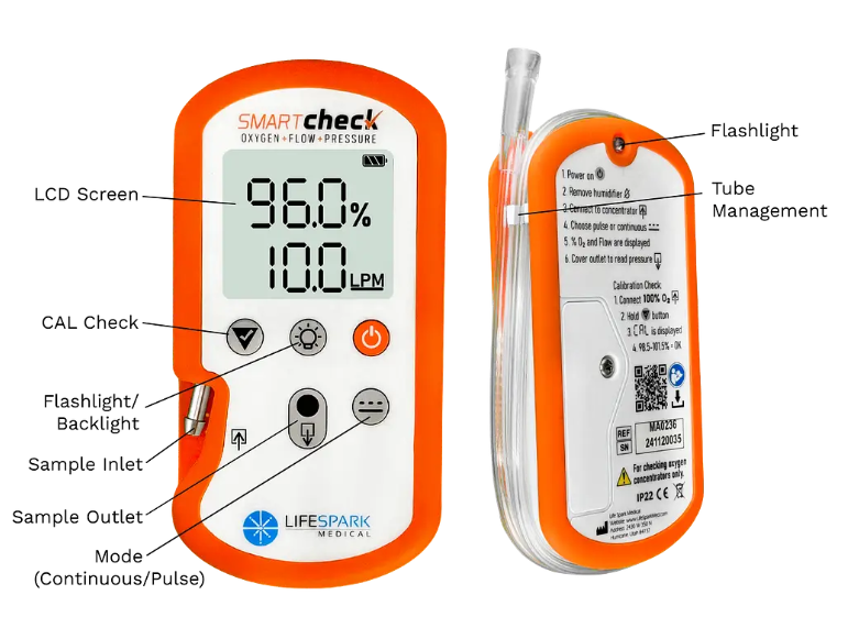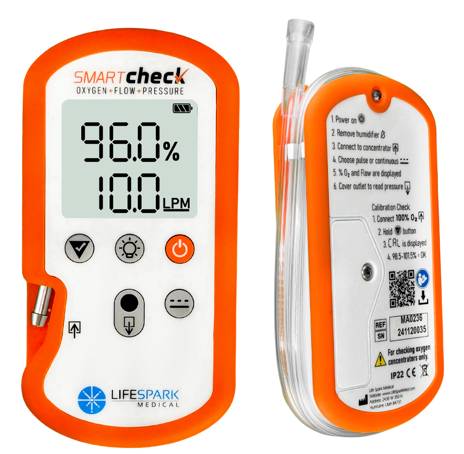 Mit dem Smart Check Sauerstoffanalysator können Sie schnell und einfach wichtige Prüfungen an Sauerstoffkonzentratoren durchführen: stationären Durchflusskonzentratoren oder Pulskonzentratoren. Das Gerät misst präzise die Sauerstoffkonzentration (in %), die abgegebene Durchflussrate in Litern pro Minute (bei stationären Konzentratoren), das abgegebene Durchflussvolumen in ml (bei Pulskonzentratoren) und den Ausgangsdruck (in PSI oder kPa). Diese Werte werden in Zehnteln angezeigt.