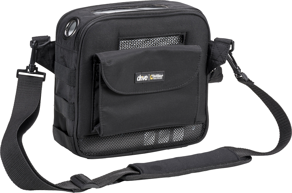 The LCD display shows both the oxygen setting and remaining battery runtime. The settings can be easily adjusted using the buttons. The side of the carrying bag has elastic loops to hold an extra battery, allowing you to stay active longer. You can charge the battery directly through the device when connected to mains or DC power. A full charge takes less than 3 hours via mains power and under 4 hours via DC power.