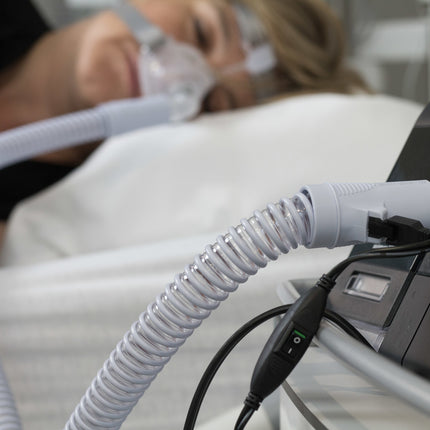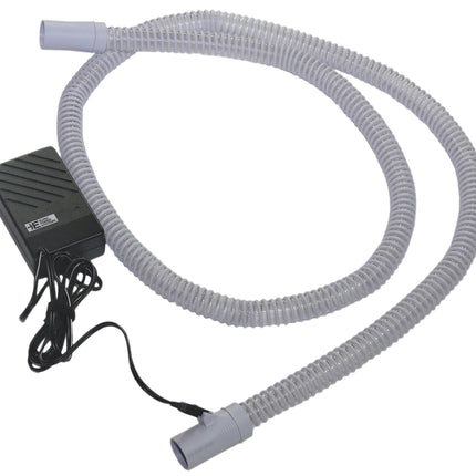 Algunos dispositivos CPAP están equipados con una conexión para un tubo calefactado, otros modelos no. ¿Está utilizando una máquina CPAP que no tiene una conexión para un tubo calefactado (Löwenstein Medical prisma SMART, por ejemplo)? Entonces, el Hybernite Superday Rainout Control System es la solución. Este sistema consiste en un tubo calefactado con una fuente de alimentación independiente (adaptador de red y cable de alimentación). Es adecuado para casi todos los CPAP. La fuente de alimentación está conectada a la red eléctrica. Gracias al interruptor de encendido/apagado, podrá encender y apagar fácilmente el tubo calefactado.