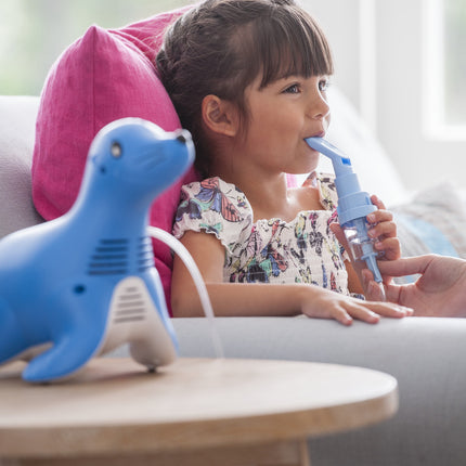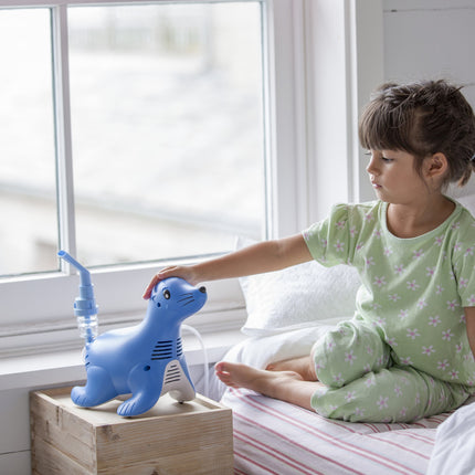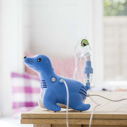 Sami le phoque est livré avec un kit de nébulisation SideStream (embout buccal et tube inclus). Votre enfant profitera d’une administration efficace du médicament liquide ou de la solution saline grâce au compresseur fiable. Une brume d’aérosol est déposée dans les voies respiratoires de votre enfant. En moyenne, une séance ne dure que 6 à 8 minutes maximum.1 Comment cela fonctionne-t-il ? Sami le phoque pousse l’air à travers le tube. L’air est également aspiré par le haut du nébuliseur. Un aérosol se produit ainsi, c’est-à-dire une brume de minuscules particules de médicament liquide.